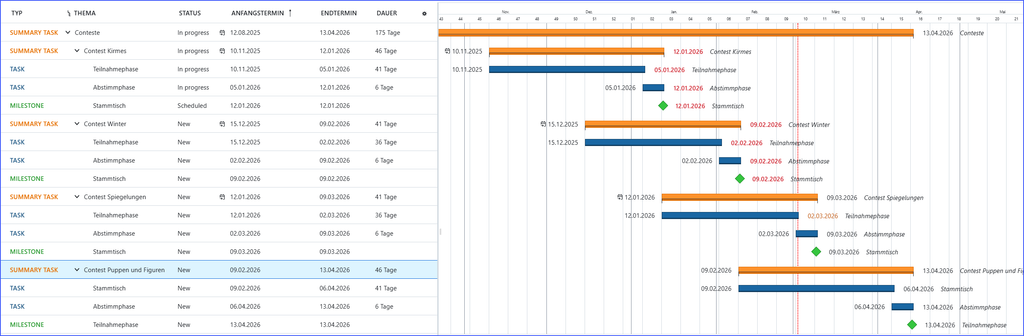 Hier ist die aktuelle Übersicht der laufenden und kommenden Foto Conteste. Den letzten Contest, wir hatten Puppen und Figuren beschlossen, habe ich heute erst aktiviert. Damit starten wir quasi etwas später, denn ein einstellen von Bildern ist bereits jetzt möglich. Auf dem kommenden Stammtisch können wir auch gern mehr als einen Folge Contest festlegen.